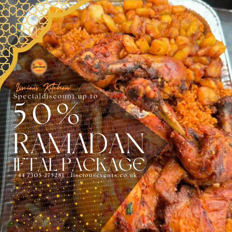 Enjoy a Special Discount of up to 50% OFF on our mouth-watering Ramadan Iftar Packages — packed with rich, smoky Jollof rice, perfectly grilled chicken, crispy sides, and authentic Nigerian flavours you love. 🍗🍚🔥